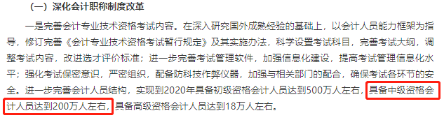 《会计改革与发展“十三五”规划纲要》中写到:“力争到2020年具备中级资格会计人员达到200万人左右”,这说明国家正在大力培养会计人才,但到2019年已经完成“十三五规划纲要”的目标。所以后续有什么新的变化谁也说不准。