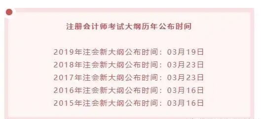 无一例外,近5年以来,都是在3月中下旬公布!现在已经进入3月15日,也就说基本上一周之内公布考试大纲是能够确定的了!届时,注会菌也将第一时间通知大家,并陆续推出大纲对比分析等!敬请关注即可!